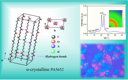 sunbet申搏新闻网讯(材料与冶金学院)近日,sunbet申搏材料与冶金学院刘玉飞特聘教授团队在生物基聚酰胺材料研究领域取得重要突破,相关成果以 Biobased Polyamide 5652 with α‑Crystal Form: Characterization and Low Moisture Absorption为题,发表于高分子领域顶级期刊Macromolecules(自然指数期刊,中科院一区TOP)。sunbet申搏官方网站材料与冶金学院为论文第一完成单位,材料与冶金学院2022级硕士研究生王艳平为第一作者,刘玉飞特聘教授为通讯作者。近年来,生物基聚酰胺56(PA56)因其原料可再生、低碳环保而备受关注,但其特殊的分子结构(戊二胺单元含奇数碳原子)导致其晶体通常以γ晶型为主,饱和吸水率高达12%以上,在潮湿环境中力学性能显著下降(如拉伸强度降低20%-30%),严重限制了在精密工程领域的应用,而传统改性方法往往以牺牲材料其他性能为代价。针对这一难题,刘玉飞特聘教授创新性地提出了双氢键结构调控策略:自主合成关键单体,设计并成功合成新型565二胺单体(C16H34N4O2),将565二胺与草酸二丁酯通过溶液聚合及