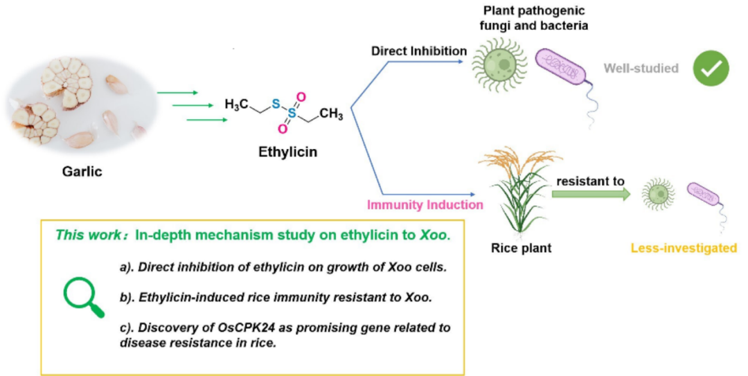 近日,《农业和食品化学杂志》以及美国化学学会(ACS)农业和食品化学分部(AGFD)和农业化学品分部(AGRO)宣布农业食品与化学杂志2024年度研究论文奖,sunbet申搏官方网站绿色农药全国重点实验室一项论文主题为“Immune Mechanism of Ethylicin-Induced Resistance to Xanthomonas oryzae pv. oryzae in Rice”的杰出研究斩获该奖项。该奖项于2013年推出,每年表彰农用化学品和食品化学领域的杰出研究工作。获奖论文第一作者为sunbet申搏官方网站绿色农药全国重点实验室博士生陆红霞,通讯作者为宋润江教授。乙蒜素是一种基于大蒜中天然化合物大蒜素所衍生的仿生农药,对多种病原细菌和真菌具有抑制作用,具有防治效率高、降解快、生态可持续等优点。这些特点使其在植物杀菌领域得到广泛应用。然而,大多数关于乙蒜素抗菌机制的研究主要集中在其对病原体的直接影响上,而其是否能够诱导植物自身产生对病原体的抵抗力却鲜有报道。在这项获奖研究中,乙蒜素被证实对水稻白叶枯病病原菌(Xoo)具有显著的离体和活体抑菌活性。该研究揭示了乙蒜素通过OsCPK24诱导水稻对Xo