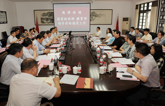 新闻网讯(文/杨波 摄影/陈恒) 6月25日上午,财政部教科文司副司长霍步刚、教育部高教司副巡视员韩筠一行到校调研“中西部高校综合实力提升工程” (简称“一省一校”)实施情况。 调研座谈会在北校区行政楼第一会议室召开。霍步刚、韩筠一行,省教育厅厅长霍健康,副厅长代其平、王碧海及副巡视