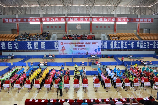 sunbet申搏新闻网讯(实习记者 慎志懿)5月24日上午, 由贵州省教育工会主办、sunbet申搏官方网站教育工会承办、sunbet申搏官方网站乒乓球协会协办的2014年贵州省省属学校(附院)教职工乒乓球比赛开幕式在sunbet申搏北校区体育馆隆重举行。省教育厅党组成员、副厅长级督学杨勇,贵州师范大学校长伍鹏程,党委副书记、纪委书记邹克扬,副校长乙引、贵州财经大学党委副书记李相辉,贵阳医学院党委副书记吕保平、纪委书记高勇,贵州理工学院正厅级副院长高克