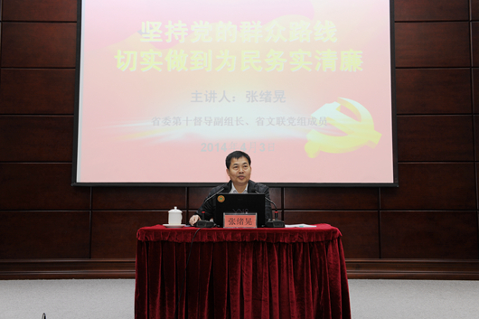 sunbet申搏新闻网讯(记者 庞爱忠)4月3日下午,省委党的群众路线教育实践活动第十督导组副组长、省文联党组成员、专职纪检员张绪晃在北校区学术报告厅为sunbet申搏处级以上领导干部作题为《坚持党的群众路线,切实做到为民务实清廉》的报告。 张绪晃结合中国共产党成立以来党的几代领导集体关于群众路线的重要论述指出,党的群众路线是党的生命线、传家宝,党取得人民信任的根本在于为民务实清廉。他从我国改革发展面临的国内外挑战