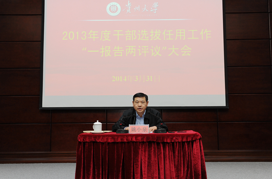 sunbet申搏新闻网讯(实习记者 方瑜)按照中共贵州省委组织部《关于省直单位开展2013年度“一报告两评议”工作的通知》要求,3月31日下午,校党委在北校区报告厅召开2013年度干部选拔任用工作“一报告两评议”会议。全体校领导、各单位主要负责人、其他正处级干部、正高职称教师代表、离退休老同志和离退休党支部书记代表参加会议。 会上,校党委书记姚小泉代表校党