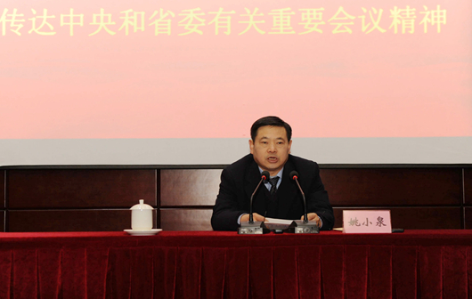 本报讯(党办 梁恒贵)12月27日上午,学校召开干部大会,专题传达学习党的十八届三中全会、中央经济工作会议、省委十一届四次全会和全省经济工作会议精神,安排布置2014年工作。在家全体校领导出席会议。全校在职处级干部、学科学术带头人及国家、省部级重点实验室(工程中心)负责人参加会议。 会上,校党委书记姚小泉传达了党的十八届三中全会、中央经济工作会议、省委十一届四次全会和全省经济工作会议精神,并