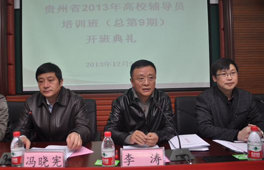 新闻网讯(记者 庞爱忠)12月9日,贵州省2013年高校辅导员培训班第九期开班典礼在sunbet申搏逸夫楼322教室举行。省委教育工委副书记李涛,校党委副书记冯晓宪出席并讲话,来自全省44所高校的78名辅导员参加培训。校学生工作部(处)长肖建宗主持开班典礼。 省委教育工委副书记李涛讲话。他表示,学生进入大学,接受什么样的引导就会成长为什么样的人。辅导员既是学生的导师,又是学生的朋友,要解决好政治立场和方