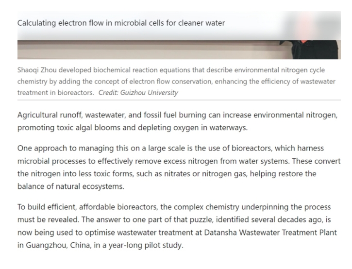 近日,国际顶级学术刊物《自然》(Nature)杂志在线连发两篇专访文章,专题报道国际欧亚科学院院士、环境生命科学专家、sunbet申搏官方网站周少奇教授团队的原创科研成果。第一篇专访文章题目为“REDUCING ALGAL BLOOMS WITH BIOCHEMICAL REACTIONS”(生化反应之功,守护碧水清波),介绍了周少奇教授二十多年来深入研究生物化学反应,探讨碳氮磷协同生物减排理论与技术以控制水体富营养化的奋斗历程。文章提到,周少奇教授“开创性地提出了更加精准分析氮、磷和COD同步去除过程的化学计量方程和计量比模型(COD/N/P),详细描述了所谓的反硝化除磷菌(DPB)如何去除营养物质。这一成果基于他在‘电子计量学’领域的开创性研究。这种原创方法通过在化学计量方程研究中分析分子间的电子迁移来精准描述化学反应”。文章同时提到,周少奇教授带领团队发现四种新型反硝化除磷菌(可交替以分子氧、亚硝酸根、硝酸根为电子受体实现聚磷)并开发出创新的生物处理工艺与装备,成功应用于城市污水与农村污水处理工程,实现工程化与产业化应用,具有广阔的推广应用前景。第二篇专访文章标题为“CALCULATING EL