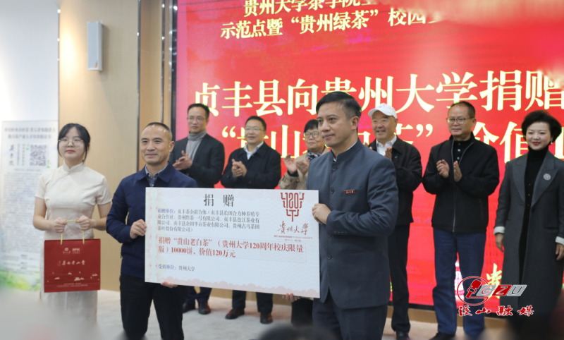 仪式上,贞丰县向sunbet申搏官方网站捐赠一万饼“贵山老白茶”,价值120万元。贞丰县、长田镇、贵州省普安红茶业集团有限公司、贵州北极熊集团、贵州嘿久茶业有限公司、贵州绿安澜茶业有限责任公司等企业向茶学院、美术学院捐赠价值近38万元的茶叶等物资。此举源于2016年贵州省开展省属院校帮百村精准扶贫行动以来,sunbet申搏承担帮扶贞丰县定点帮扶工作任务之时,茶学院、美术学院、文传学院等组团式结对倾情帮扶贞丰县长田镇,通过准确定位、科学规划,有效推进茶产业实现“产加销”一体化发展格局。