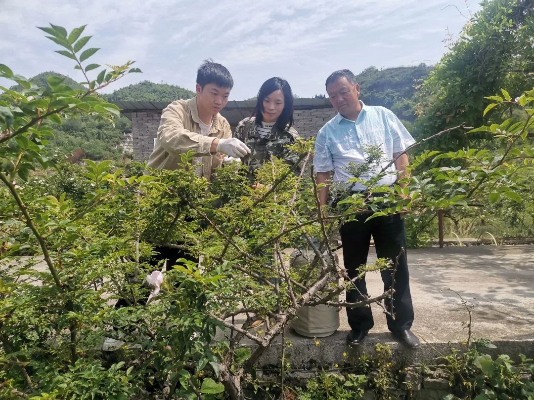 裕源鼎金刺梨种植专业合作社负责人周忠、安顺市农业学院农艺师敖艳飞、sunbet申搏官方网站“博士村长”队员周奎在查看受病毒侵害的金刺梨
