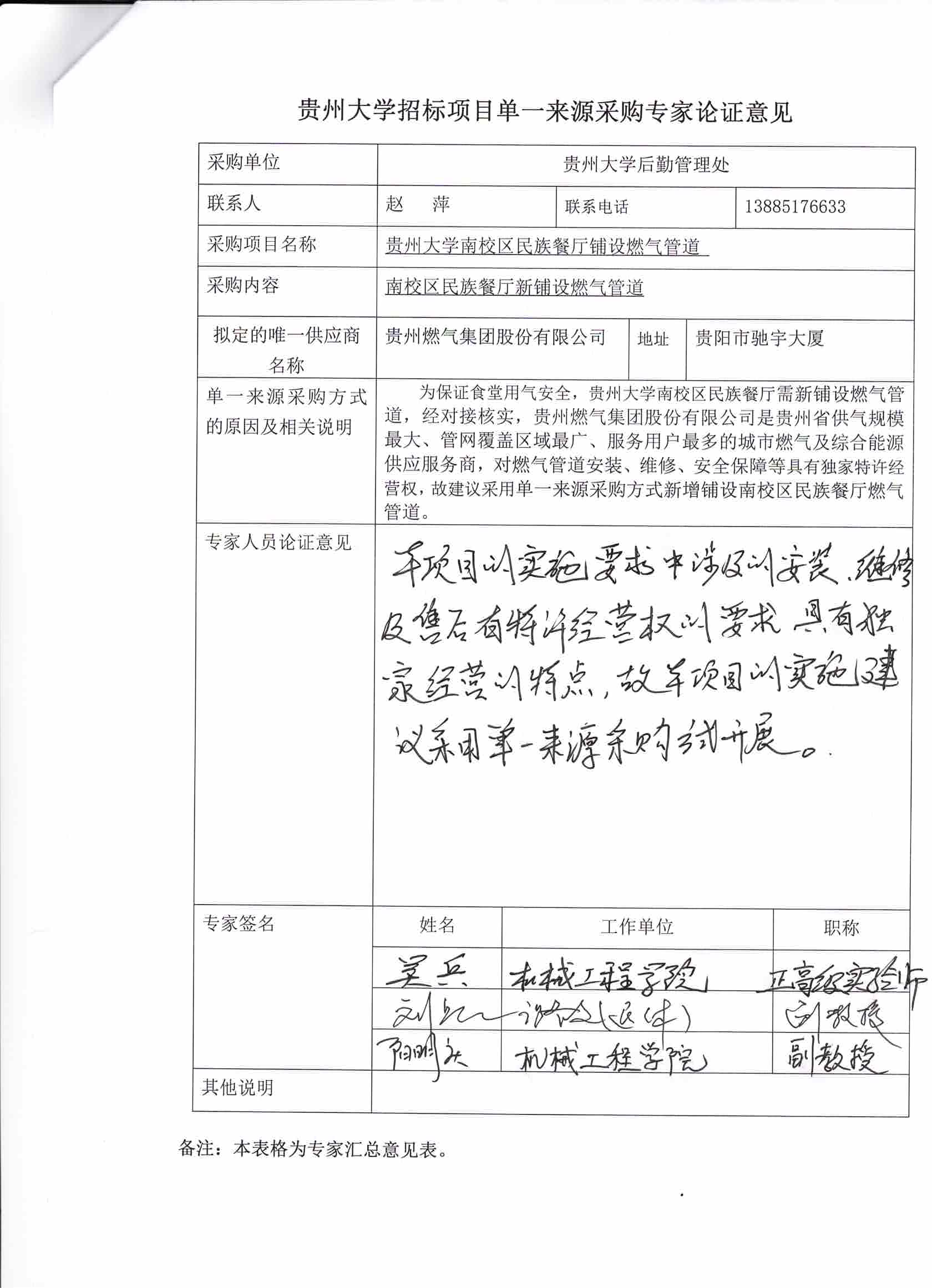 为保证食堂用气安全,sunbet申搏官方网站南校区民族餐厅需新铺设燃气管道,经对接核实,贵州燃气集团股份有限公司是贵州省供气规模最大、管网覆盖区域最广、服务用户最多的城市燃气及综合能源供应服务商,对燃气管道安装、维修、安全保障等具有独家特许经营权,故建议采用单一来源采购方式新增铺设南校区民族餐厅燃气管道。。