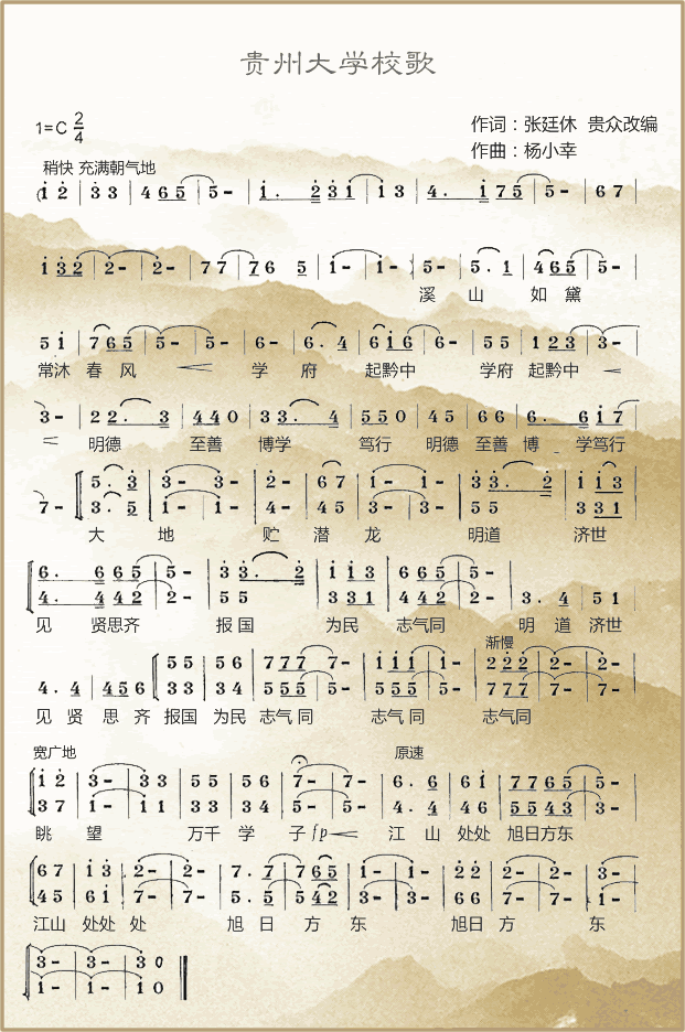 校歌浅释: “溪山如黛,常沐春风,学府起黔中”,采用比兴手法,既是取景,又是抒情,更是写实。意谓黔中大地之上,遥望溪山美景,蓝天白云之下,林木郁郁葱葱,溪水如碧玉织带,一派生机,有如染上了薄薄的一层墨绿色,一座气势宏伟的现代型学府拔地而起,经历了百余年的发展历史,如今自然与人文相互衬映,人与万物都沐浴在春风化雨之中,显得更加地灵人杰,风物宜眼,前途无量。 “明德至善,博学笃行,大地贮潜龙”,均以用典的方法,点出了全校师生的理想追求以及今天人才济济的盛况。 “明德至善,博学笃行”为sunbet申搏官方网站校训。“明德至善”,出自《大学》“大学之道,在明明德,在亲民,在止于至善。”意思是大学的根本宗旨,首先在于透彻地了解和彰显内在人性固有的道德光明,然后必须转向社会民间作自立立人,即亲近人民并竭尽全力为之服务,最后则要通过个人修身与社会实践,使社会和人都臻于和诣圆满的至善至美的理想境界。 “博学笃行”乃中国传统儒家文化治学的根本方法,出自《中庸》“博学之,审问之,慎思之,明辨之,笃行之”。意思是必须广博地学习,审慎地询问,慎重地思索,明晰地辨析,笃实地履行,才能真正达到理想的学问境界和人生境界。前四句“学问思辨”,乃是致知的渐进升华过程;后一句“笃学之”,则指踏实的实践功夫。 只有通过知与行两个方面的不懈努力,才能在人生境界与学问知识上真正有所成就。歌词举二而涵盖五,当视为“学问思辩行”的全面概括。 “大地贮潜龙”,“潜龙”典出《易经.乾》:“潜龙勿用”,意谓尚在黔省最高学府就学的莘莘学子,虽如潜龙一般专心向学, 有着无以限量的光明前途,必将在不久的将来对祖国对人民作出巨大的贡献。如果说“潜龙”取意于“天行健,君子以自强不息”的精神,那么“大地”则既指黔中大地,又暗喻坤卦“地势坤,君子以厚德载物”的精神。全句大意是:黔中大地的sunbet申搏官方网站,为国家民族培养储备了无数的有用人才,他们像“潜龙”一样,既有“自强不息”的精神,又有“厚德载物”的品质,必将在不远的将来,为国家民族作出自己应有的贡献。 第三段“明道济世,见贤思齐,报国为民志气同”。《论语.里仁》:“见贤思齐焉,见不肖而内自省也。” 意思是青年学子进德修业,要担当道义,热爱祖国,胸怀天下,救助社会,服务人群,在报国为民的共同理想感召下,同心同德,志存高远。在学习过程中,看到比自己优秀的人,便要想着向他们看齐;看到缺点比自己多的人,便要时刻注意反省。全句大意是:要勇于追求人生的真谛,发扬光大真理(道),要做到见贤思齐,见不肖而内自省。 最后一段“眺望万千学子,江山处处旭日方东”。意思是登上黔中大地高高耸立的山脉,极目远眺,万千群山逶迤绵延,有似群龙飞舞,宛如无数莘莘学子立地倚天,汇成天地般的磅礴气势,共同奔向无限美好的未来。而一轮红日亦在此时从东方冉冉升起,照耀着祖国山河大地,无论人与自然,都显得更加朝气蓬勃,更加美丽娇娆。 |