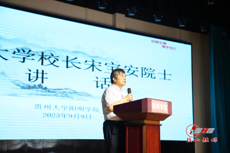 On September 9th, an inaugural ceremony for the general education course "Introduction to Yangming's Heart-Mind Philosophy" was conducted on the southern campus. In attendance were Professor Zhang Xuexi from Department of Philosophy and Religious Studies and the Institute for Traditional Chinese Studies of Peking University, GZU President Song Bao'an, the instructional team responsible for this course, the group responsible for compiling thetextbook related to the course, faculty from Yangming College, as well as more than 800 student representatives from other colleges. The event was presided over by Chen Yanbo, Dean of Yangming College.
