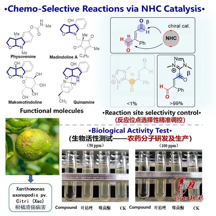 The first research endeavor, as illustrated in Figure 2, realized NHC-catalyzed asymmetric chemoselective control over enedials. It was established that chemoselectivity predominantly hinges on the oxidative-reductive attributes of the substrate/catalyst. The research team employed LC-HRMS characterization and DFT calculations to eliminate the influence of steric hindrance on selectivity within the reaction system. This approach empowers precise management of selective reactions among similar functional groups within compound molecules, yielding chiral Furo[2,3-b]pyrroles of remarkable optical purity. Furthermore, these chiral compounds have exhibited notable antibacterial activity against citrus canker bacteria.