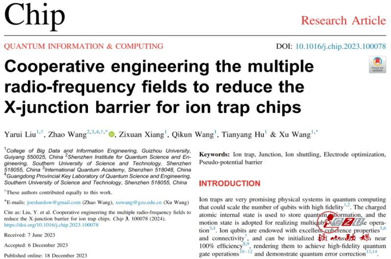 A groundbreaking research paper co-authored by Guizhou University vice president Wang Xu’s research team and a team from the Shenzhen Institute for Quantum Science and Engineering of Southern University of Science and Technology (SUSTech) was published in Chip, a top international journal in infotech, in late 2023. Titled “Cooperative engineering the multiple radio-frequency fields to reduce the X-Junction barrier for ion trap chips”, the paper reports a method to cooperatively optimize the trapping potential field distribution near the junction electrode of the ion trap chip using multiple radio-frequency fields, in order to reduce the trapping potential barrier and anomalous phonon heating. Its first author and co-first author are GZU’s Liu Yarui and SUSTech’s Wang Zhao. The latter, alongside Professor Wang Xu, is also a corresponding author.
