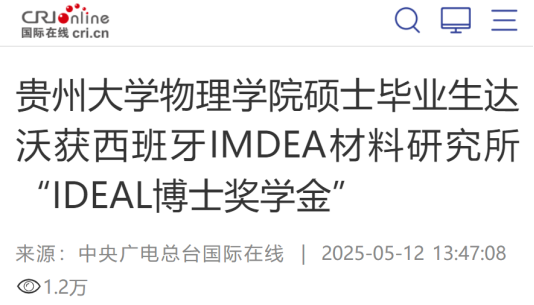 国际在线:sunbet申搏官方网站物理学院硕士毕业生达沃获西班牙IMDEA材料研究所“IDEAL博士奖学金”