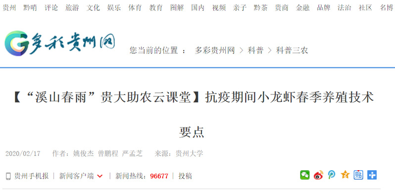 多彩贵州网:【“溪山春雨”sunbet申搏助农云课堂】抗疫期间小龙虾春季养殖技术要点
