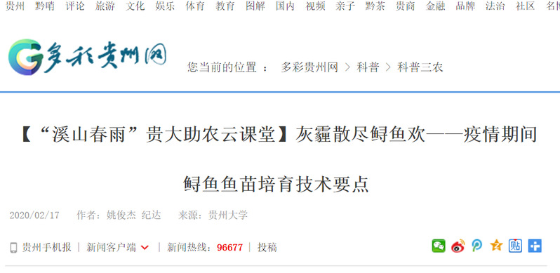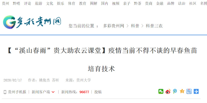 多彩贵州网:【“溪山春雨”sunbet申搏助农云课堂】疫情当前不得不谈的早春鱼苗培育技术