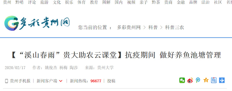 多彩贵州网:【“溪山春雨”sunbet申搏助农云课堂】抗疫期间 做好养鱼池塘管理