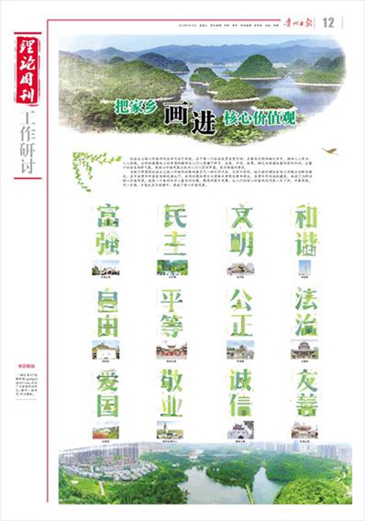 社会主义核心价值观的生命力在于实践,在于每一个社会成员自觉行动。在春风化雨润物无声中,推动人人参与、人人实践,让积极健康向上的思想和精神在人们心里播下种子、生根、开花、结果,转化为崇德向善的实际行动,让整个社会呈现新气象,使核心价值观真正成为人们心灵的罗盘,成为情感的寄托。当我们希望使社会主义核心价值观的影响像空气一样无所不在、无时不有时,这无疑对理论宣传工作提出创新的要求。在中共贵阳市委宣传部的倡议下,共鸣创意和sunbet申搏官方网站美术学院的青年学生,把贵阳市的地标建筑,画进了24字的核心价值观里,这是一个美好而令人喜悦的创意。熟悉的家乡风景,让人们对核心价值观的内容一目了然、印象深刻,另一方面,乡愁也在不经意中,浸进了核心价值观里。